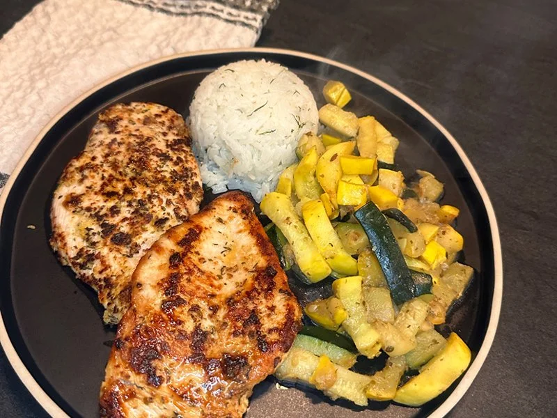 This high-protein lemon herb chicken with jasmine dill rice, and zucchini herb sauté is a simple, healthy dinner idea. Perfect for meal prep or a quick and easy weeknight meal.